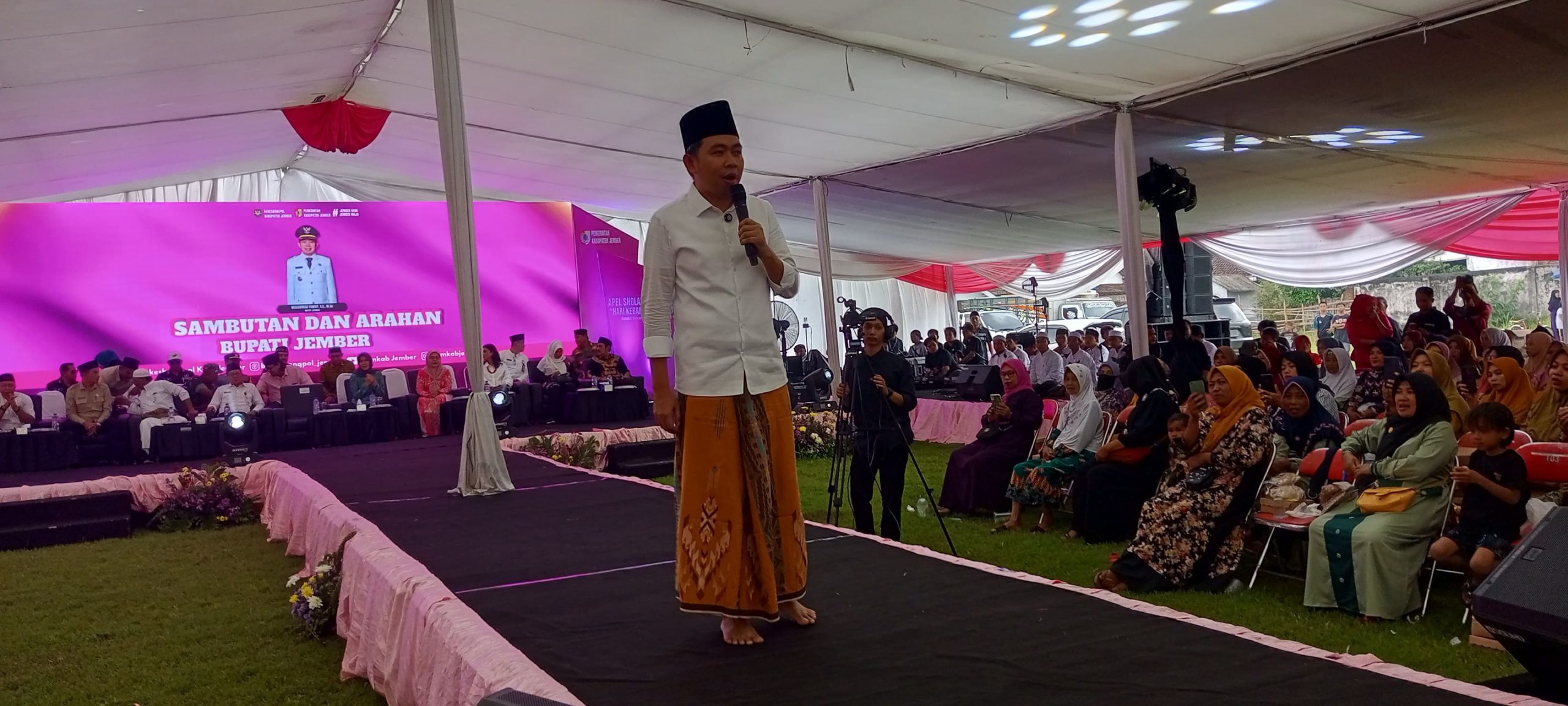 Acara kemudian lanjut dengan lagu Indonesia Raya, hening cipta dipimpin langsung oleh Bupati Jember, H. Muhammad Fawaid SE, MSc, lalu sambutan yang… syukurlah, gak sampai bikin ngantuk.