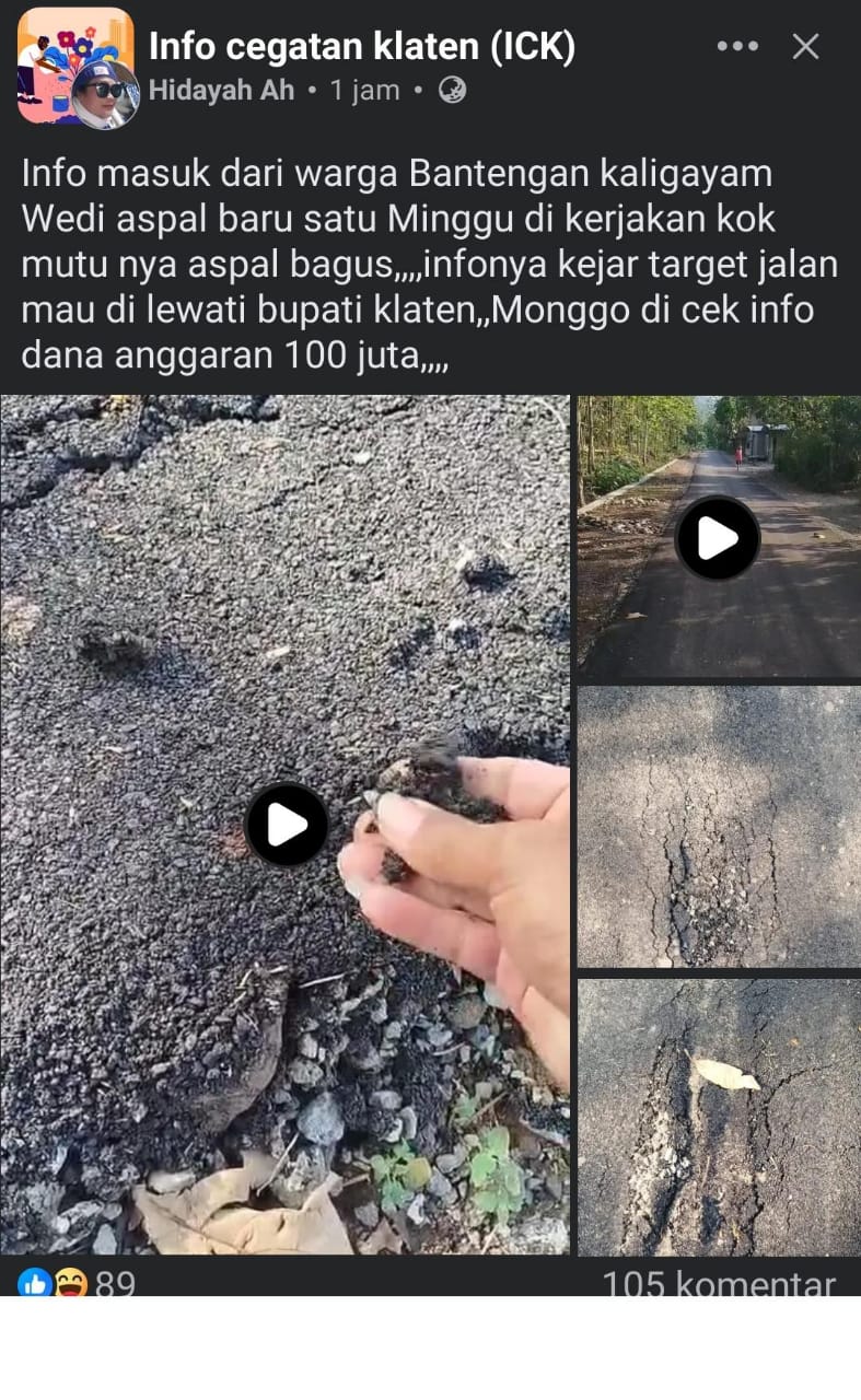 Video ini pertama kali nongol di Facebook Info Cegatan Klaten lewat akun Hidayah Ah (iya, nama aslinya Hidayah, tapi sabarnya kayak udah habis). Dalam video berdurasi 30 detik itu, warga kompak nonton jalan retak kayak nonton sinetron azab — sambil ngelus dada, “Ya Allah, 100 juta cuma seminggu, Gusti…” 😭