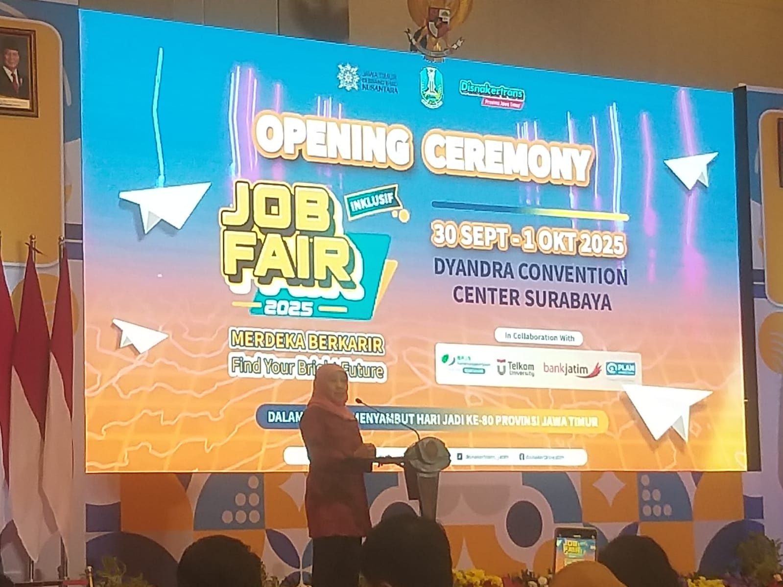 Habis bicara duka, Bu Khofifah balik lagi ke panggung semula. Soal kerjaan. Job Fair ini katanya jadi obat buat yang kena PHK atau baru lulus tapi bingung mau kerja apa. Ada 5.589 lowongan kerja terbuka, dari yang linier sama ijazah sampai yang linier sama nasib.