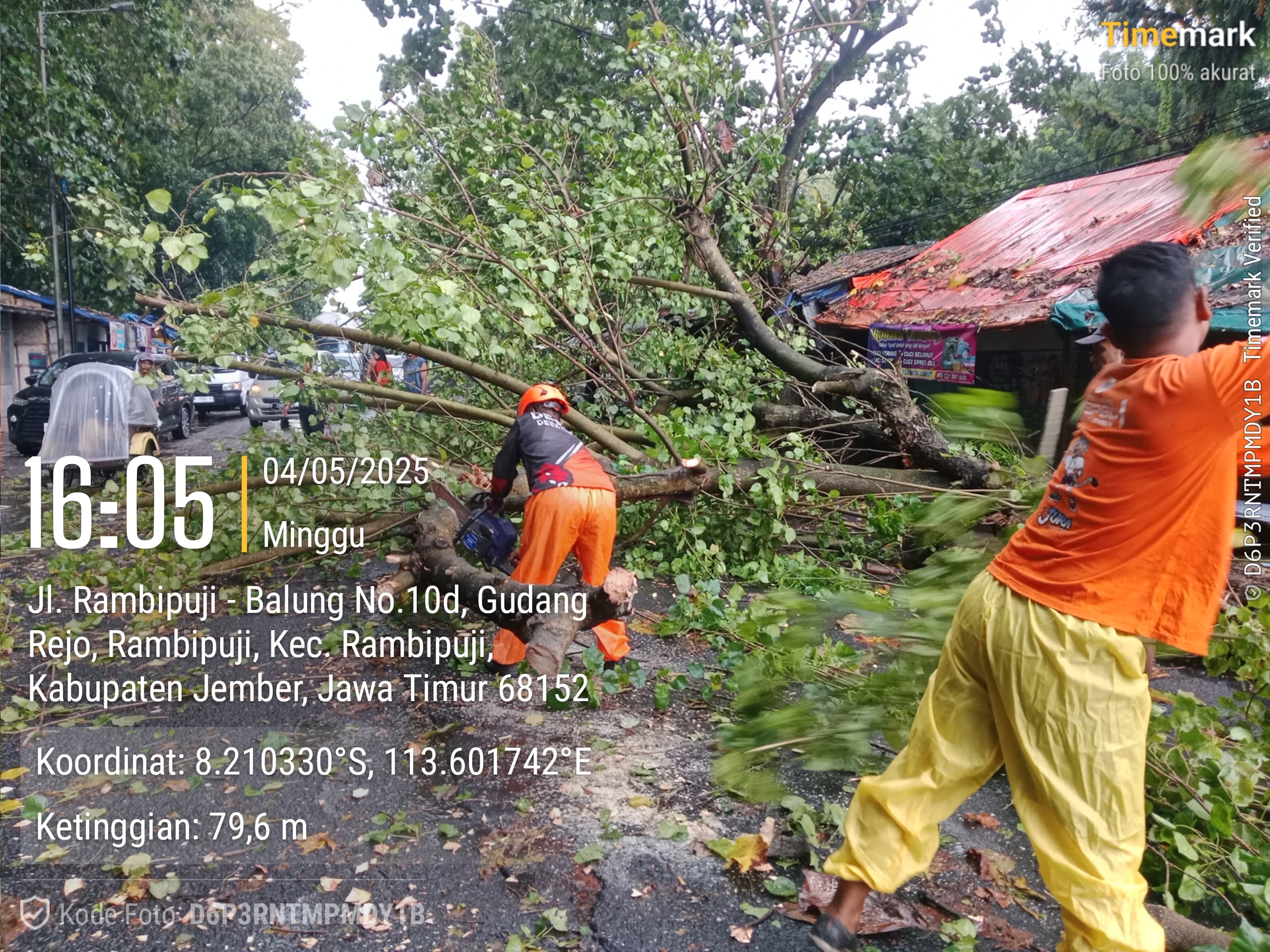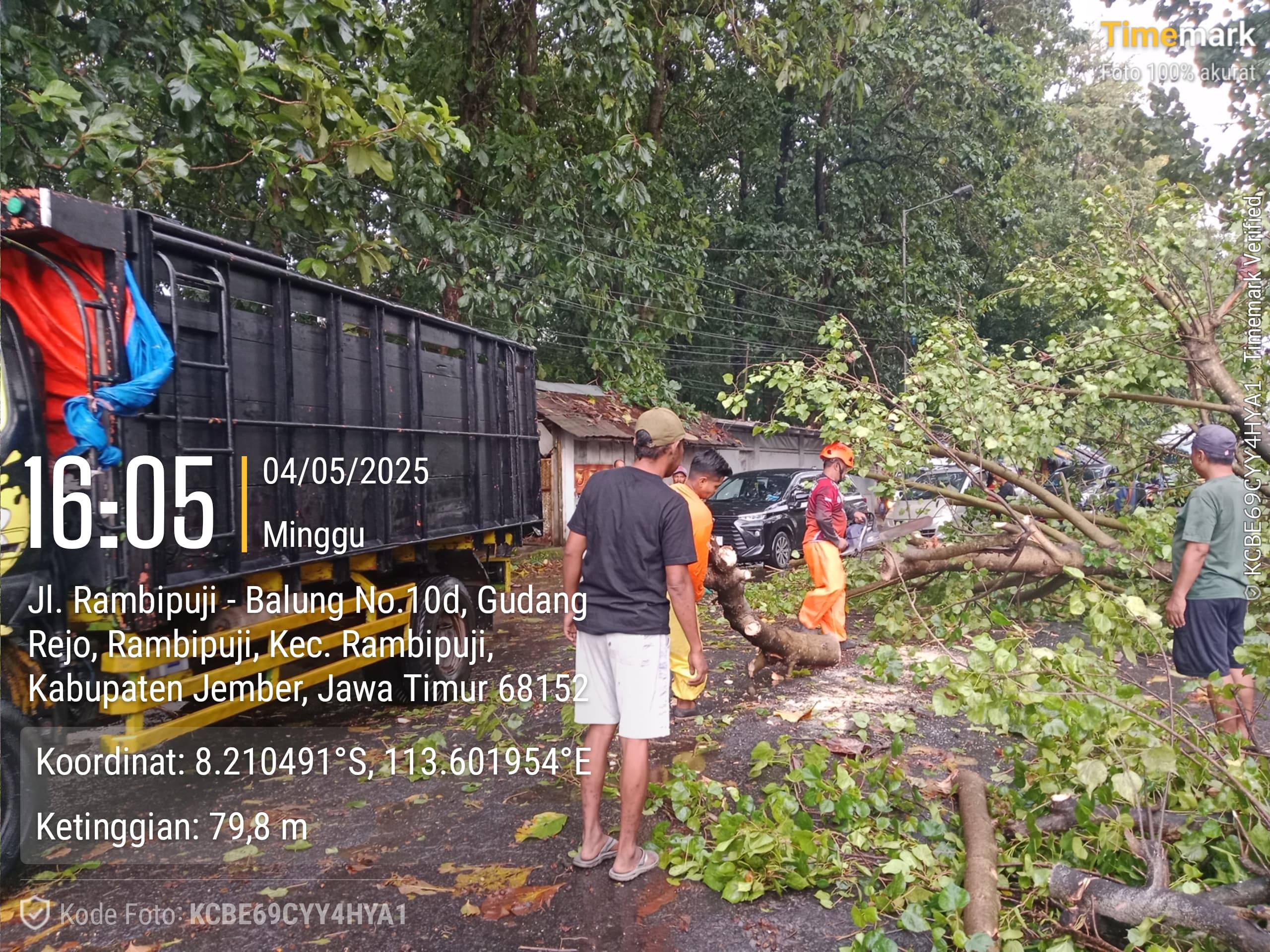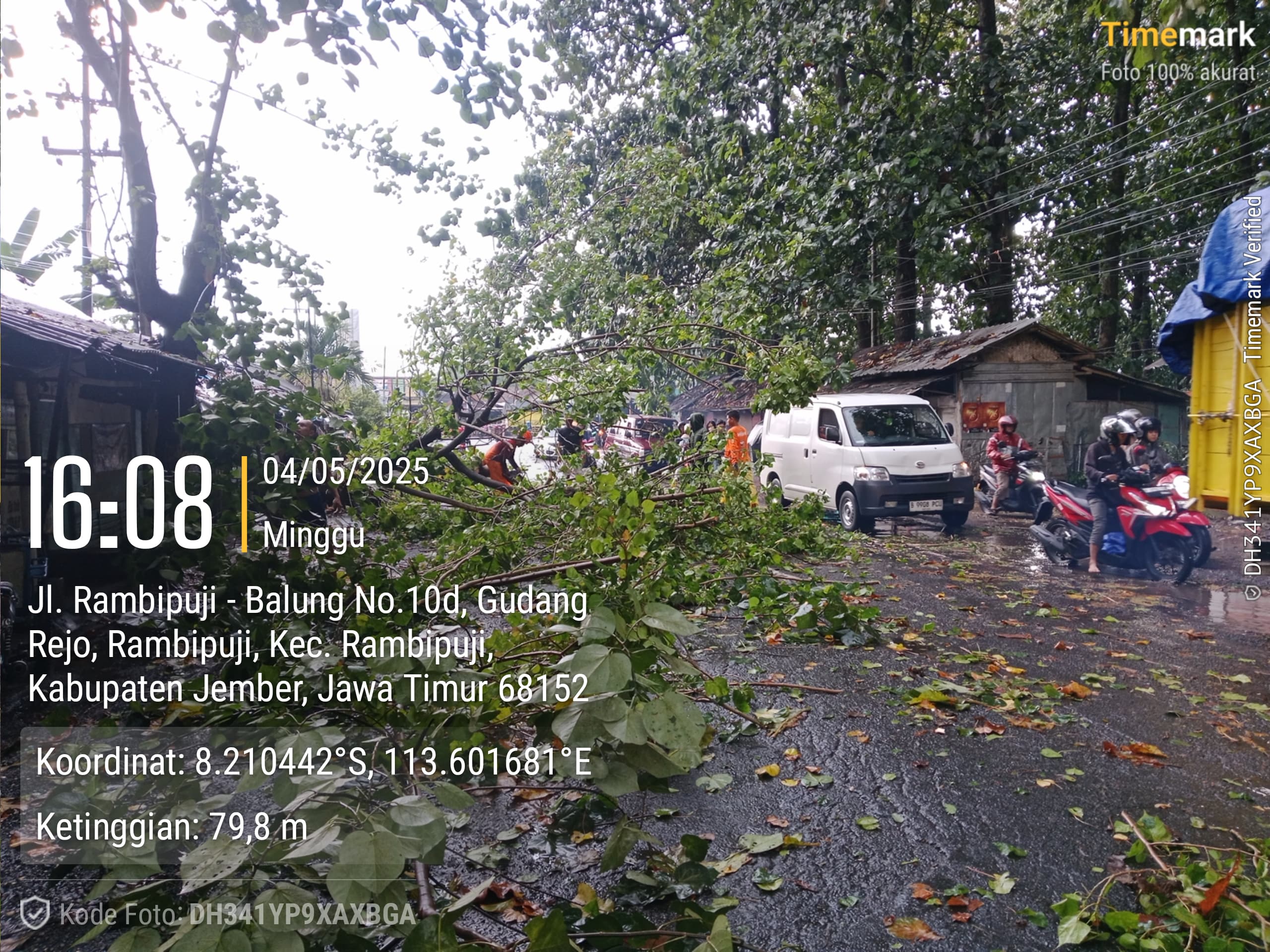 Mendengar kabar pohon tumbang, Cak Wito dan pasukannya dari DPC 08 langsung meluncur bersama Tim Destana Desa Rambipuji. Tak pakai babibu, mereka gotong chainsaw, tebas dahan, bersihin jalan—semua dilakukan sambil tetap menjaga gaya. Bahkan katanya ada yang sambil nyetel dangdut pelan-pelan biar makin semangat.